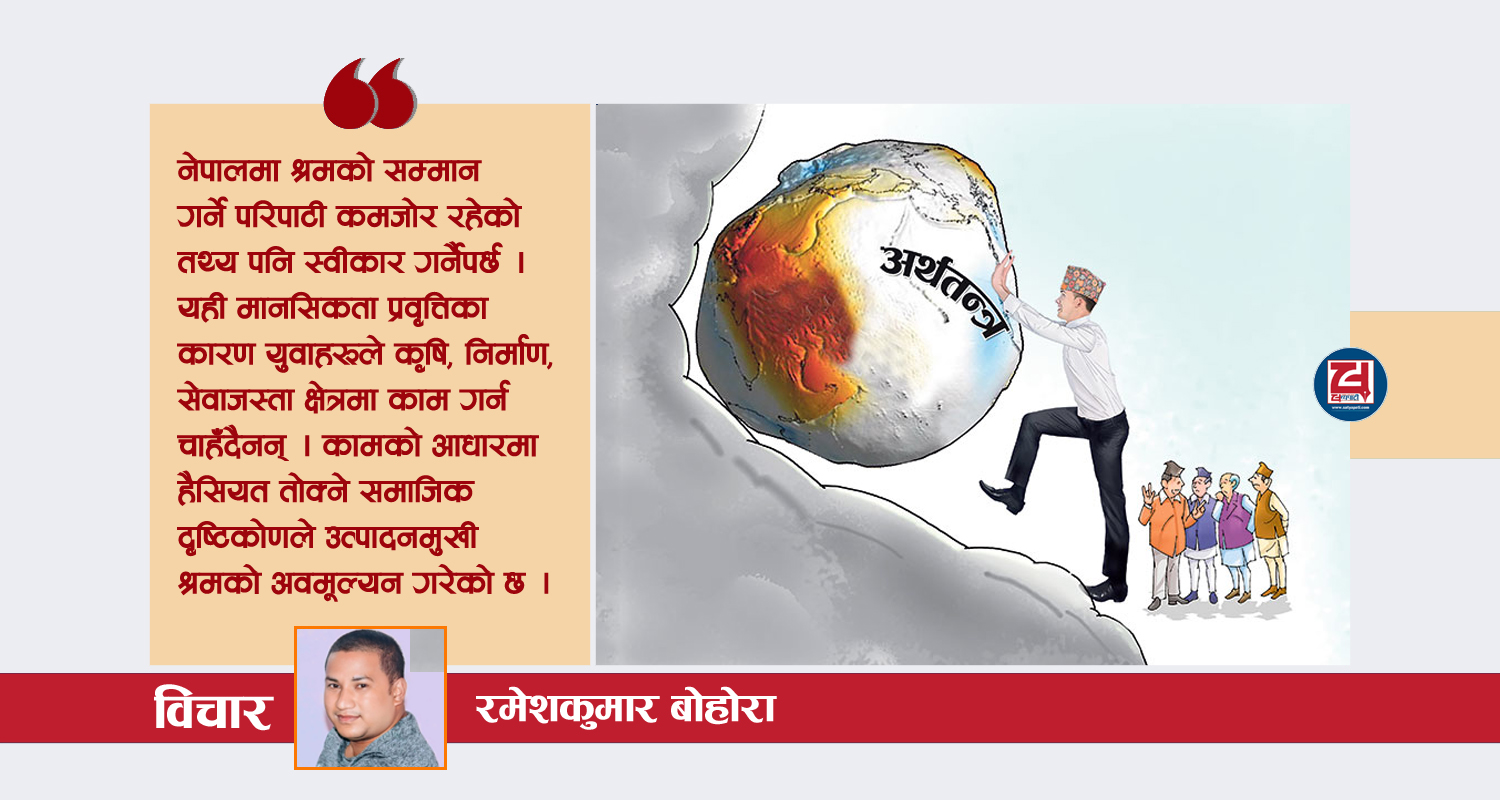 नेपालमा श्रमको सम्मान गर्ने परिपाटी कमजोर रहेको तथ्य पनि स्वीकार गर्नैपर्छ । यही मानसिकता प्रवृत्तिका कारण युवाहरूले कृषि, निर्माण, सेवाजस्ता क्षेत्रमा काम गर्न चाहँदैनन् । कामको आधारमा हैसियत तोक्ने समाजिक दृष्टिकोणले उत्पादनमुखी श्रमको अवमूल्यन गरेको छ । पश्चिमी देशहरूमा जस्तो ‘सजिलो अप्ठ्यारो होइन काम काम हो’ भन्ने भावना नेपालमा विकास हुन नसक्दा पनि उद्योगहरू जनशक्ति अभावले चल्न नसकेको अवस्था देखिन्छ । यो समस्याको समाधान भनेको लामो अवधिको योजनाबद्ध दृष्टिकोणबाट आउन सक्छ ।