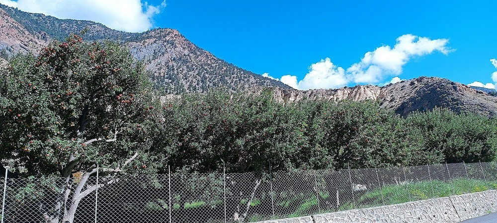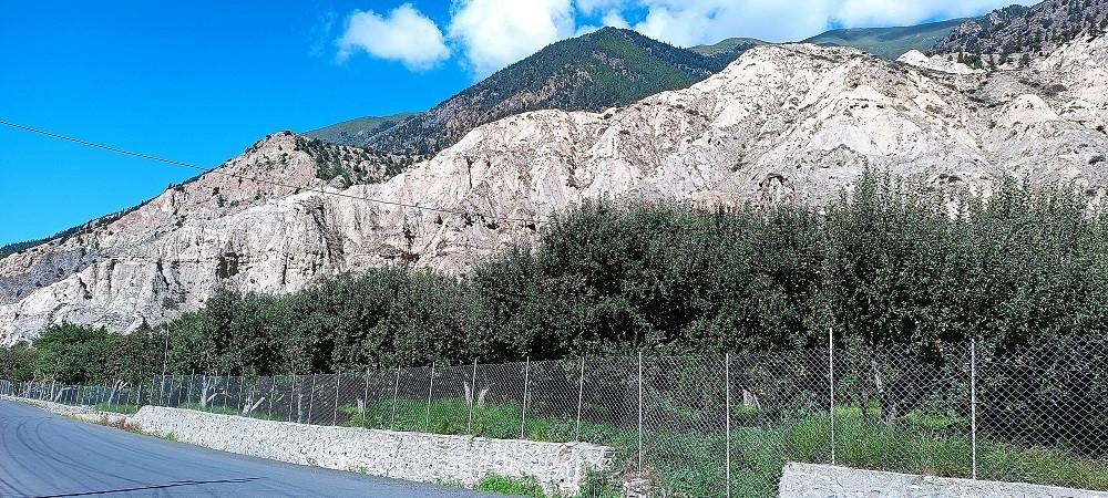 मुस्ताङको घरपझोङ गाउँपालिका–२ स्थित मार्फा गाउँका व्यवसायी विष्णुराज हिराचनको बगैँचामा लटरम्म फलेको स्याउ र आसपासको दृश्य । स्याउको राजधानीको रूपमा परिचित मार्फाका किसानहरूले मात्रै बर्सेनि करोडौँको स्याउ बिक्री गर्ने गरेका छन् । तस्वीर : सुशीलबाबू थकाली । रासस