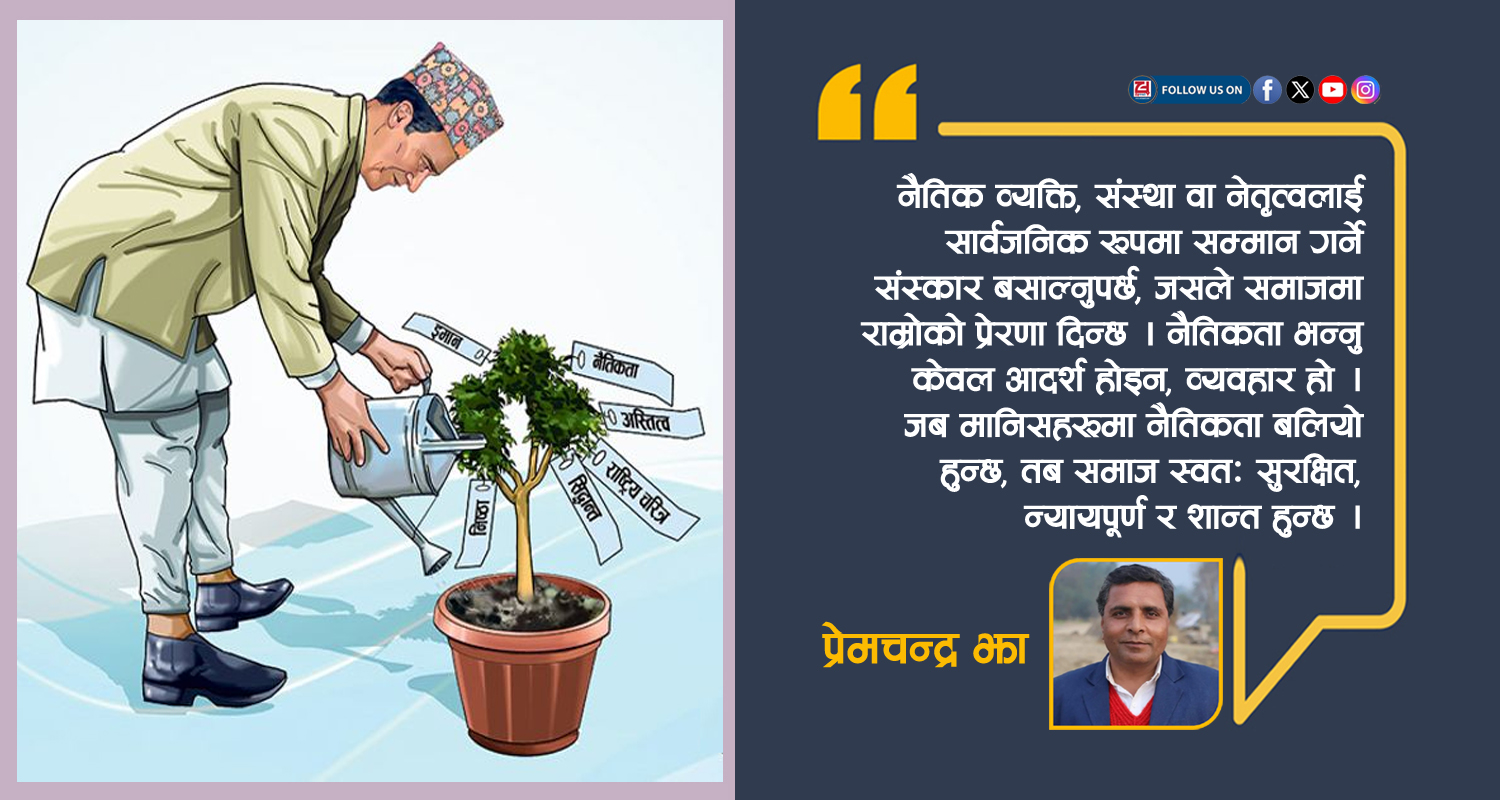 अन्तिममा, नैतिक व्यक्ति, संस्था वा नेतृत्वलाई सार्वजनिक रूपमा सम्मान गर्ने संस्कार बसाल्नुपर्छ, जसले समाजमा राम्रोको प्रेरणा दिन्छ । नैतिकता भन्नु केवल आदर्श होइन, व्यवहार हो । यो हाम्रै बोली, चालचलन, सोच, कर्म, सम्बन्ध र जिम्मेवारीमा झल्किन्छ । जब मानिसहरूमा नैतिकता बलियो हुन्छ, तब समाज स्वतः सुरक्षित, न्यायपूर्ण र शान्त हुन्छ । तर जब नैतिकता कमजोर हुन्छ, तब कानुनले मात्र सबै कुरा रोक्न सक्दैन । नेपालमा आज जुन संकटहरू छन्, भ्रष्टाचार, बेरोजगारी, राजनीतिक अस्थिरता, सेवा प्रवाहमा कमजोरी, शिक्षा र स्वास्थ्यमा गिरावट, सामाजिक असहिष्णुता, यी सबैको मूल कारण नै नैतिकताको कमी हो । जब व्यक्ति, संस्था, र राज्य नैतिक बन्छ, तब कानुन, नीति, योजना र विकास स्वाभाविक रूपमा सफल हुन्छन् । त्यसैले अब समय आएको छ कि हामी सबै, राजनीतिज्ञ, कर्मचारी, महिला, विद्यार्थी, किसान, व्यापारी, पेशाकर्मी, मिडिया, र सामान्य नागरिक, आ–आफ्नो ठाउँबाट नैतिकता अभ्यासमा लागौं । त्यसैबाट मात्रै साँचो परिवर्तन सम्भव हुन्छ । व्यक्तिको आत्मा शुद्ध भए समाज स्वतः सबल हुन्छ । अनि मात्र राष्ट्र बन्न सक्छ, न्याययुक्त, समावेशी, स्वाभिमानी र समृद्ध । (लेखक नेपाल पत्रकार महासंघ रौतहट शाखाका पूर्व अध्यक्ष हुन् ।)