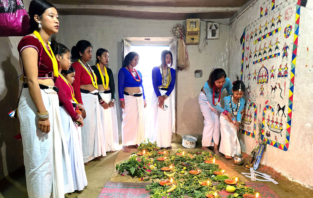 दाङको घोराही उपमहानगरपालिका–१४ स्थित झिङौराका स्थानीय थारु युवतीहरु आइतबार बिहान ‘अष्टिम्की चित्र’मा पूजा गर्दै । थारु समुदायमा कृष्ण जन्माष्टमीका दिन पूजा गरेको अष्टिम्की चित्रलाई भोलिपल्ट बिहान पुनः पूजा गरे उक्त पर्व समापन गरिन्छ । तस्वीर : कुलदीप न्यौपाने । रासस