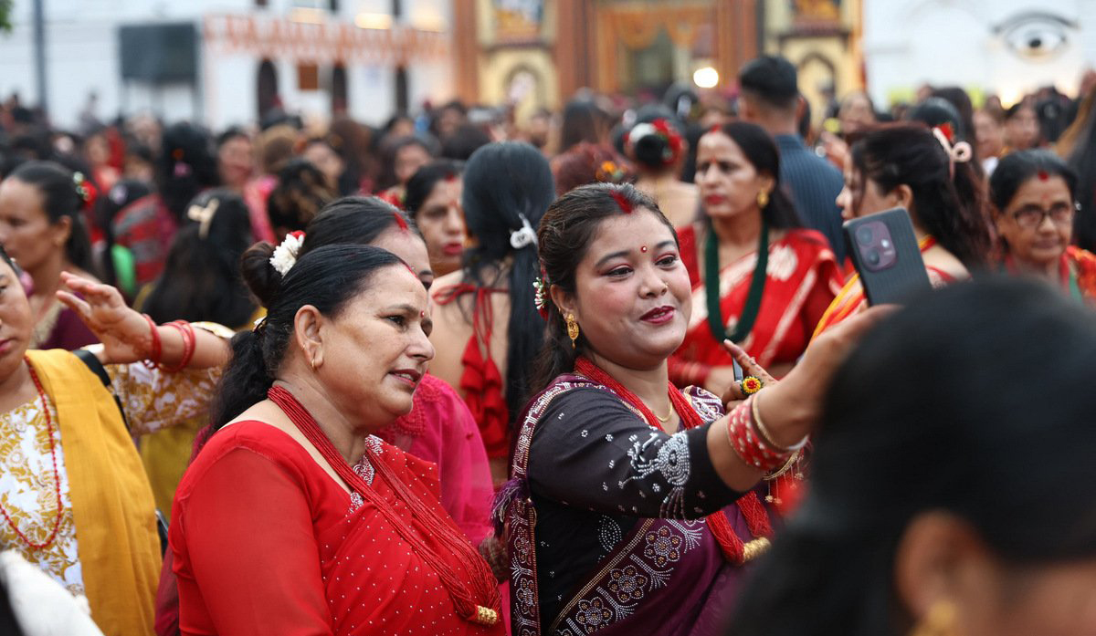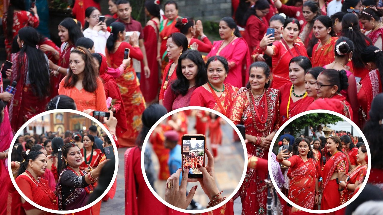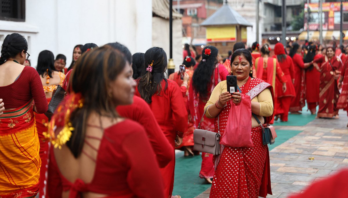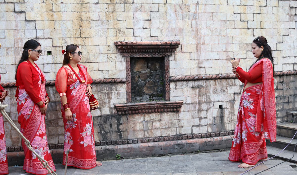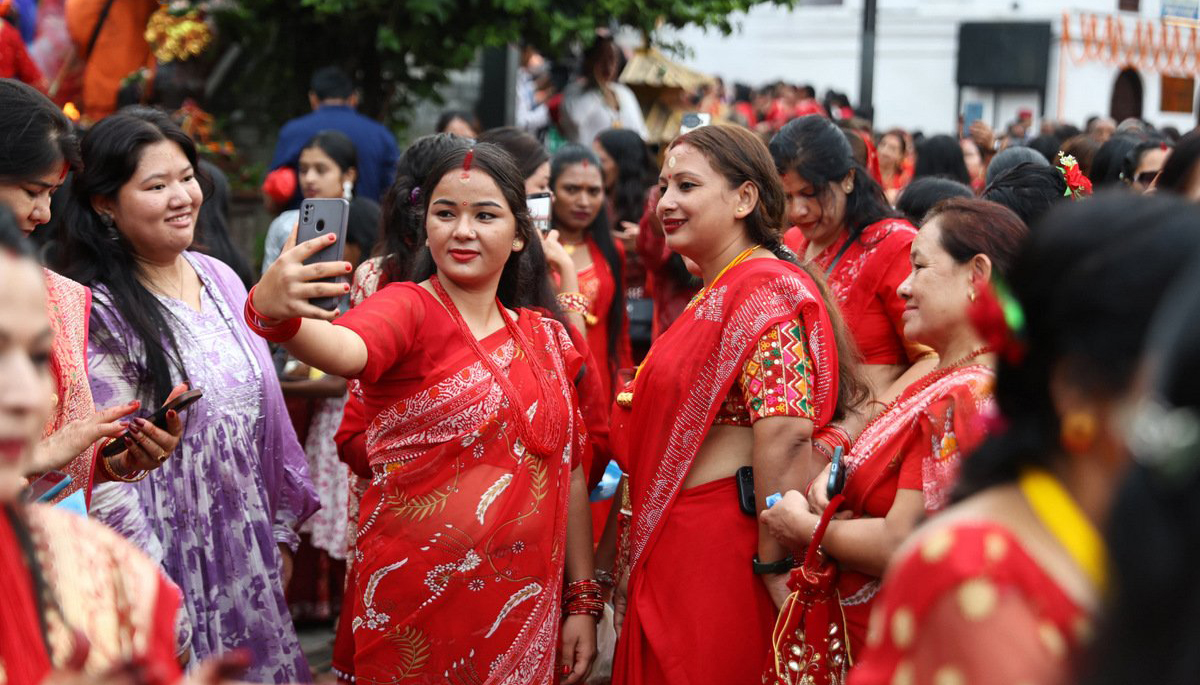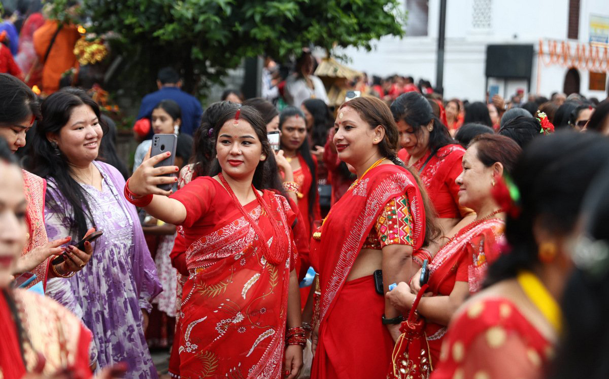 शास्त्रअनुसार भाद्र शुक्ल तृतीयामा हरितालिका व्रत लिनाले सुख, शान्ति र कल्याण प्राप्त हुने विश्वास छ । पशुपतिमा भेला भएका महिलाहरूले शिवजीको दर्शन गर्नुका साथै नाचगान गरेर टिकटक बनाउन व्यस्त छन् । तस्वीरहरू : नेपाल फोटो लाइब्रेरी