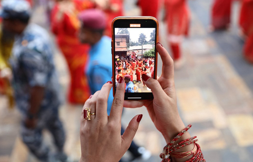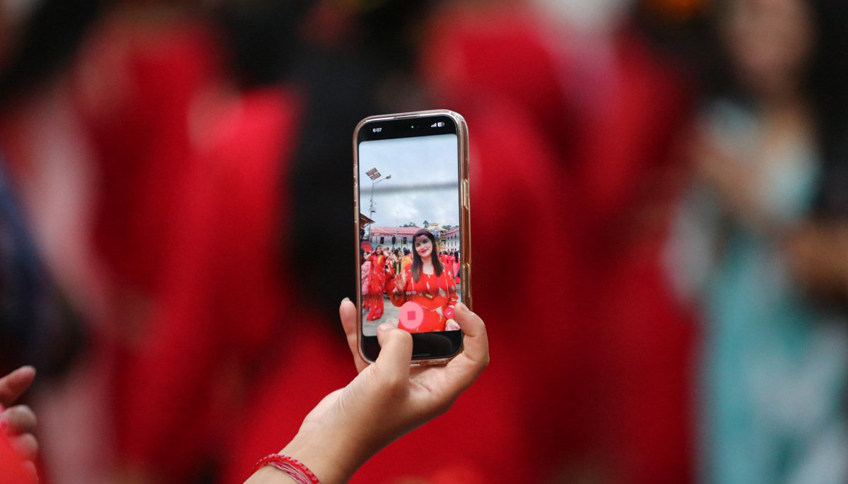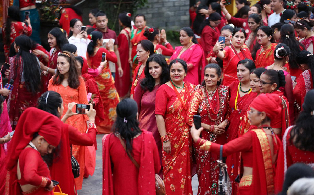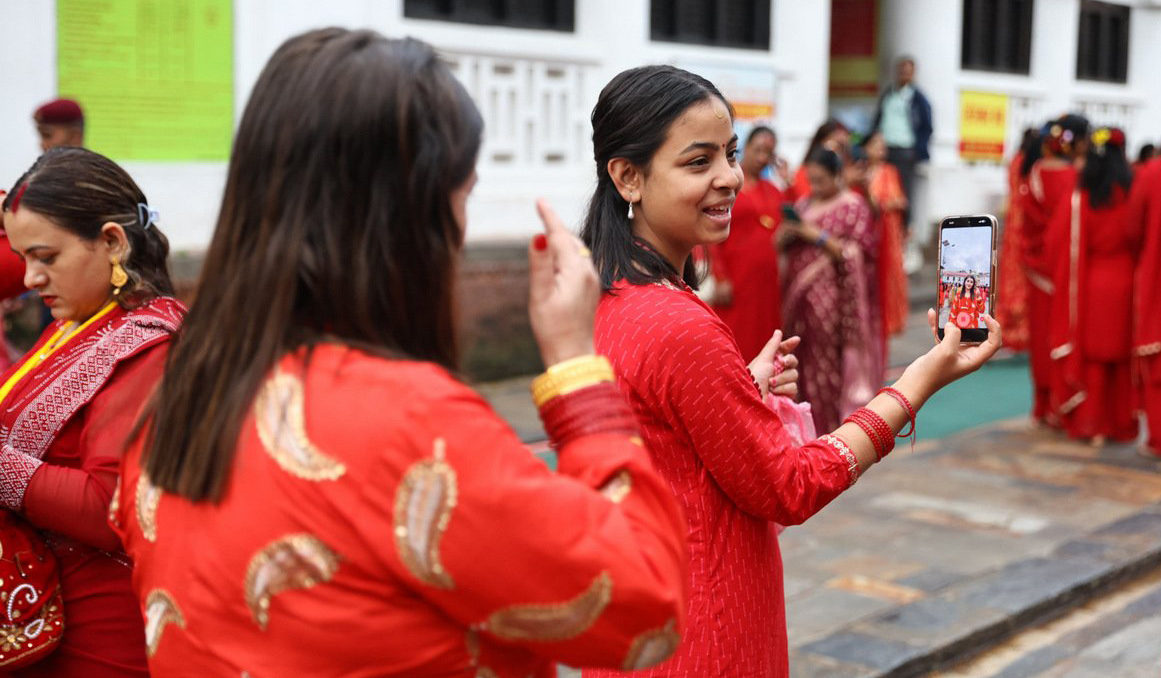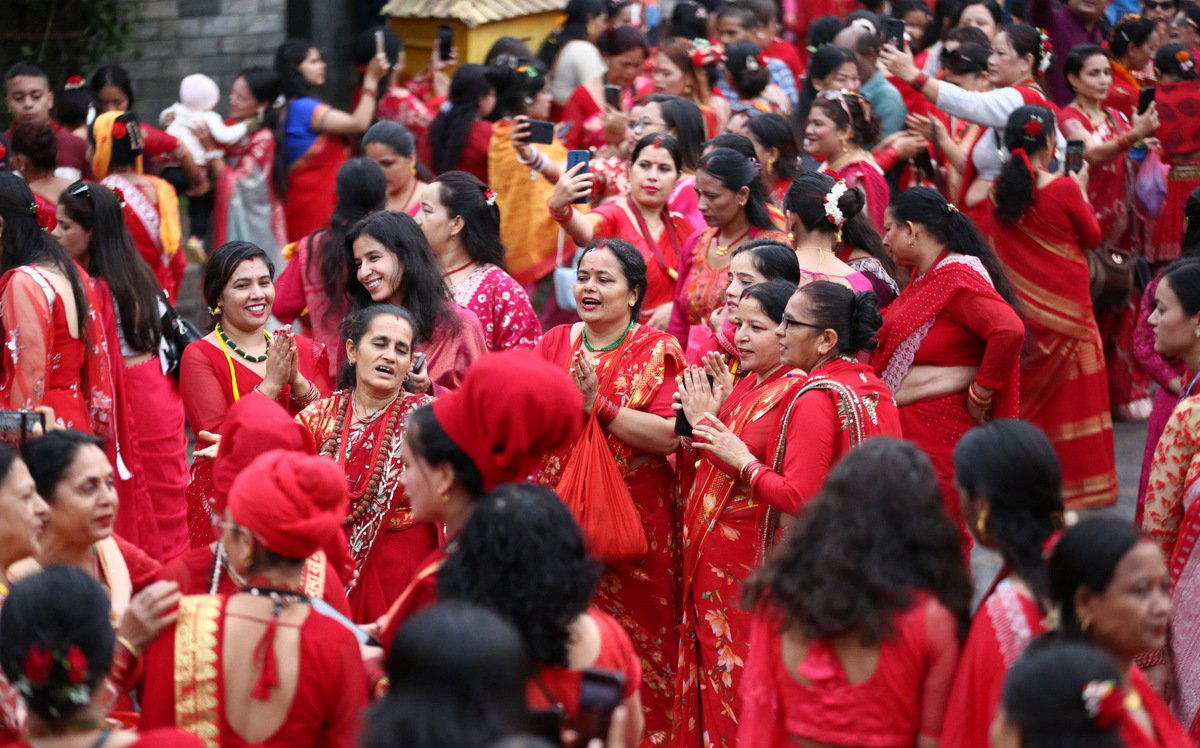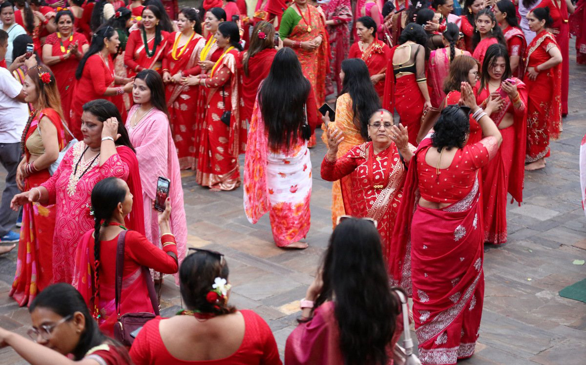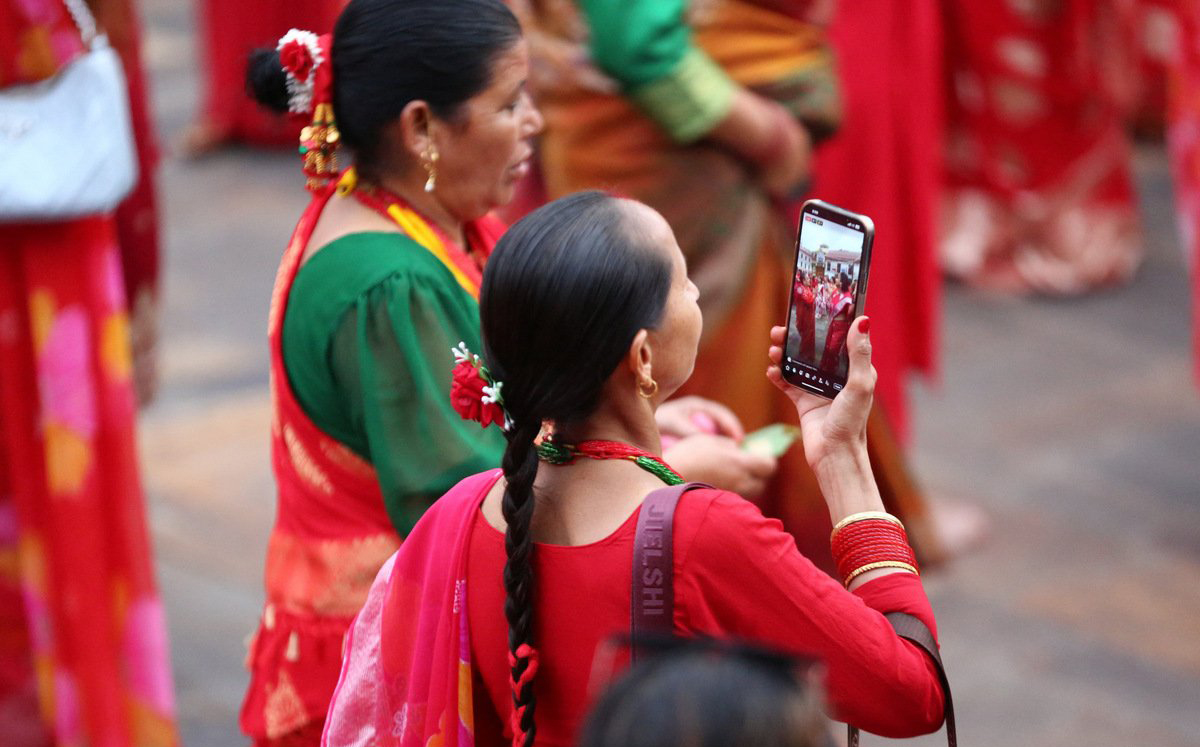 शास्त्रअनुसार भाद्र शुक्ल तृतीयामा हरितालिका व्रत लिनाले सुख, शान्ति र कल्याण प्राप्त हुने विश्वास छ । पशुपतिमा भेला भएका महिलाहरूले शिवजीको दर्शन गर्नुका साथै नाचगान गरेर टिकटक बनाउन व्यस्त छन् । तस्वीरहरू : नेपाल फोटो लाइब्रेरी