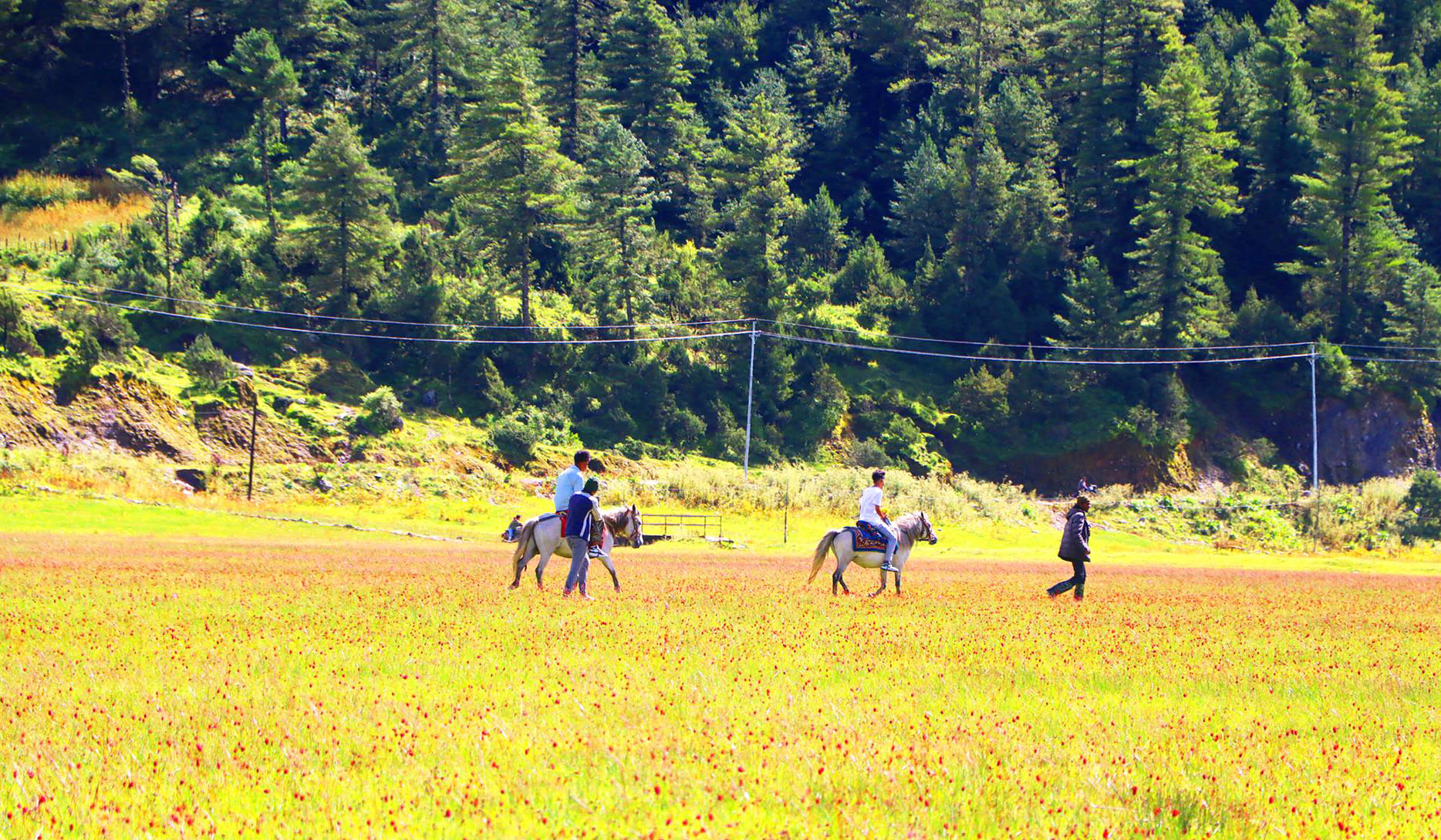 नेपालको एक मात्र सिकार आरक्ष ढोरपाटन उपत्यकामा घोडा चढेर घुम्दै आन्तरिक पर्यटक । पछिल्लो समय ढोरपाटनमा आउने पर्यटकले घोडामा यात्रा गर्न रुचाउने गर्छन् । तस्वीर : डम्मर बुढामगर । रासस