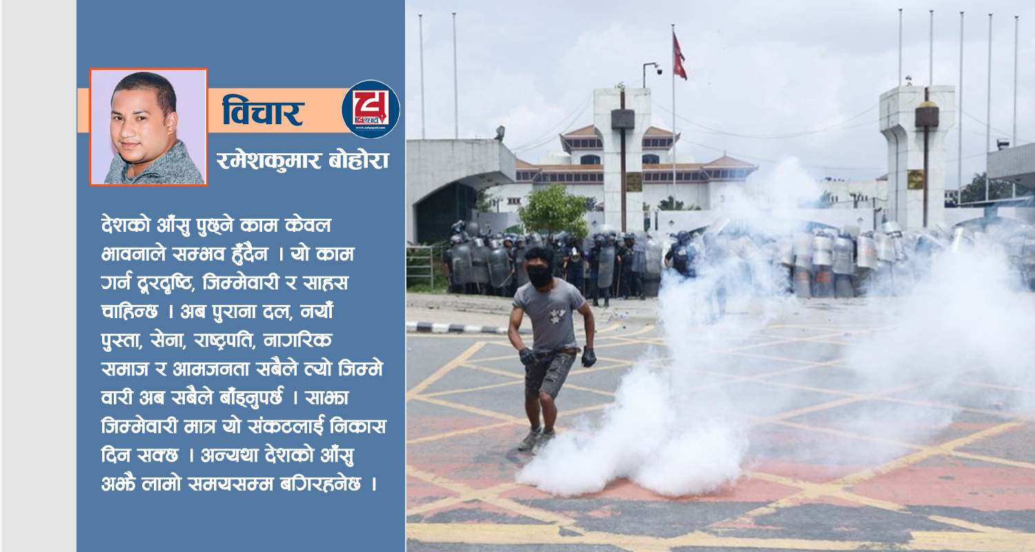 एउटा बाटो अराजकता, विघटन र दीर्घकालीन अस्थिरतामा लैजाने छ भने अर्को बाटो संवाद, सहमति र संस्थागत स्थायित्वतर्फ लैजानेछ । कुन बाटो रोज्ने भन्ने निर्णय आजको नेतृत्व र नयाँ पुस्ताले गर्नुपर्नेछ । यदि असफल भयौं भने केवल संरचना मात्र होइन, सम्पूर्ण राष्ट्र अस्तित्वमै संकटमा पर्छ । देशको आँसु पुछ्ने काम केवल भावनाले सम्भव हुँदैन । यो काम गर्न दूरदृष्टि, जिम्मेवारी र साहस चाहिन्छ । अब पुराना दल, नयाँ पुस्ता, सेना, राष्ट्रपति, नागरिक समाज र आमजनता सबैले त्यो जिम्मेवारी अब सबैले बाँड्नुपर्छ । साझा जिम्मेवारी मात्र यो संकटलाई निकास दिन सक्छ । अन्यथा देशको आँसु अझै लामो समयसम्म बगिरहनेछ ।