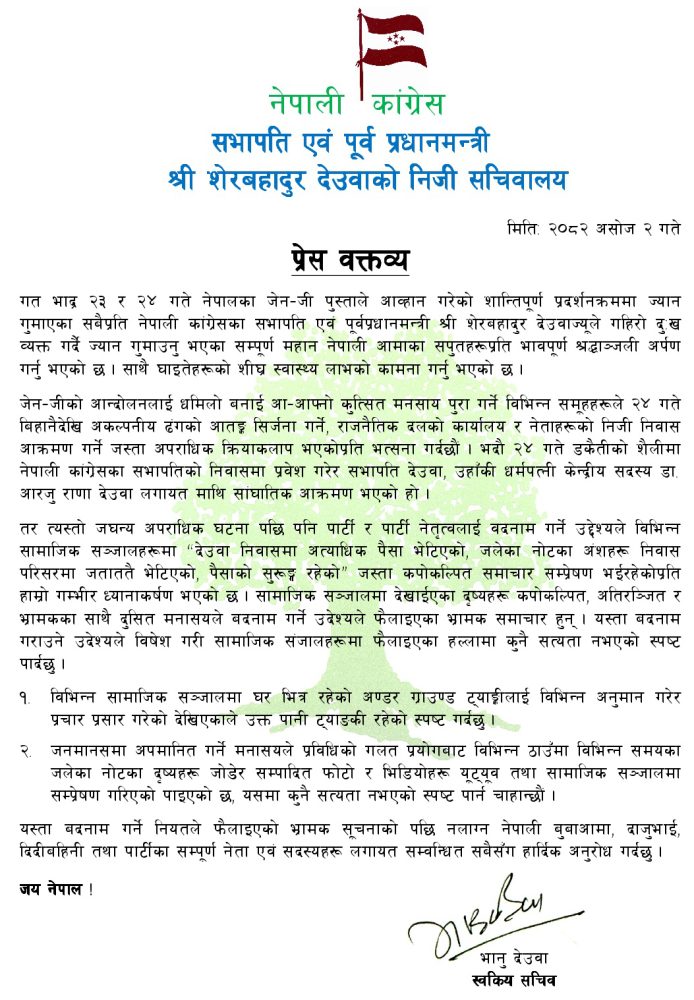 ‘जनमानसमा अपमानित गर्ने मनासयले प्रविधिको गलत प्रयोगबाट विभिन्न ठाउँमा विभिन्न समयका जलेका नोटका दृश्यलाई जोडेर सम्पादित फोटो र भिडियोहरू युट्यबु तथा सामाजिक सञ्जालमा सम्प्रेषण भएको पाइएको छ, यसमा कुनै सत्यता नभएको स्पष्ट पार्न चाहन्छौं,’ विज्ञप्तिमा छ । जेनजी प्रदर्शनका क्रममा ज्यान गुमाएका शहीदहरूप्रति कांग्रेस सभापति देउवाले दुःख जनाउँदै श्रद्धाञ्जली व्यक्त गरेको र घाइतेको शीघ्र स्वास्थ्य लाभको कामना गरेको स्वकीय सचिव भानु देउवाले उल्लेख गरेका छन् ।