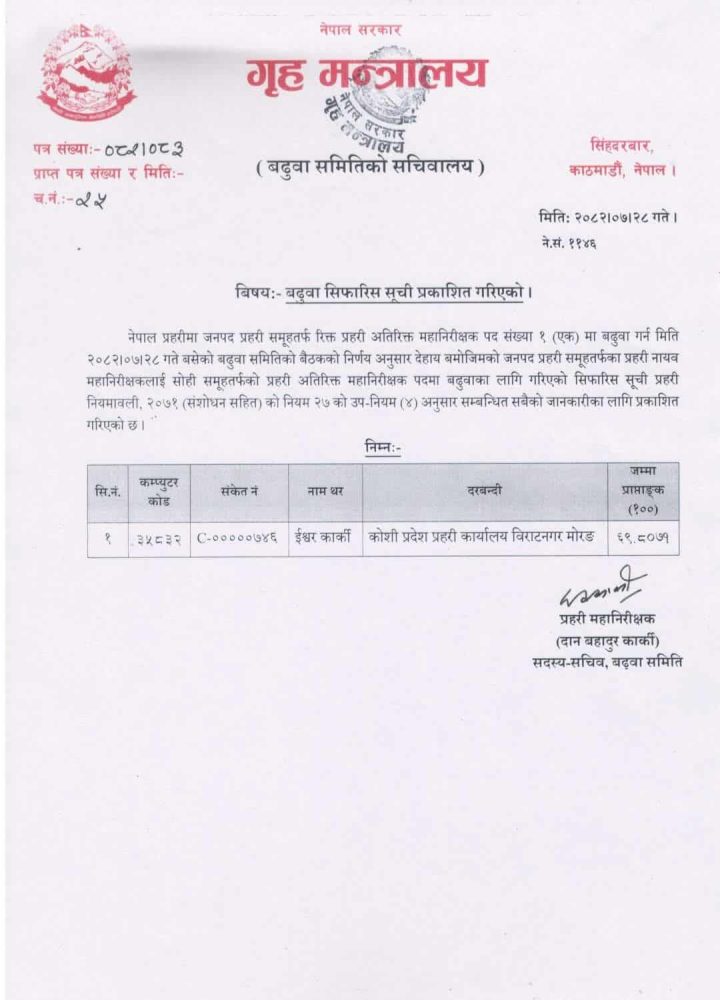 नेपाल प्रहरीका प्रहरी नायब महानिरीक्षक (डिआइजी) ईश्वर कार्कीलाई प्रहरी अतिरिक्त महानिरीक्षक (एआइजी) पदमा बढुवाका लागि सिफारिस गरिएको छ ।