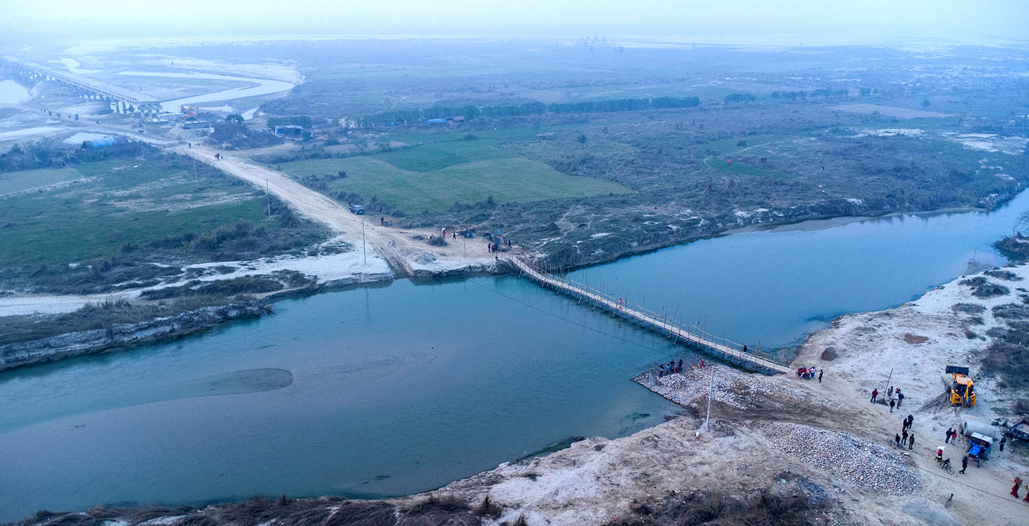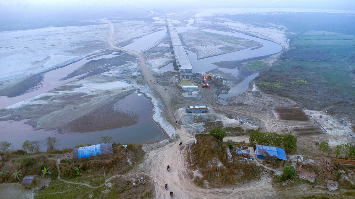 सञ्चालनमा आउनुअघि नै भाँसिएर करिब १३ वर्षदेखि निर्माणाधीन रहेको धनुषा–सिराहा जोड्ने कमला पुलको पुनःनिर्माण गर्दै ठेकेदार कम्पनी पप्पु-लुम्बिनी जेभी । २०८३ असार मसान्तसम्म निर्माण सम्पन्न गरी सरकारलाई हस्तान्तरण गर्ने कम्पनीको तयारी छ । तस्वीर : अमरेन्द्रकुमार यादव । रासस