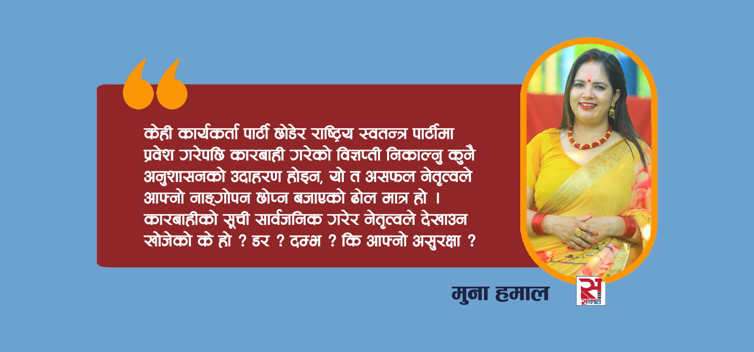 कार्यकर्ताले पार्टी बदलेको देखेर आत्तिनु, कारबाहीको विज्ञप्ती निकाल्नु, निसानाको नाममा धम्की दिनु, यी सबै पतनको लक्षण हुन्, नेतृत्वको कमजोरीका संकेत हुन् । कम्युनिष्ट आन्दोलन कुनै व्यक्तिको निजी कम्पनी होइन, जहाँ मालिकले ब्रान्ड फेरोस्, तर कामदारले जागिर बदल्न नपाओस् । आज कारबाही गरिएका कार्यकर्तालाई इतिहासले दोषी ठहराउने छैन । दोषी ठहरिनेछ त्यो नेतृत्व, जसले पार्टीलाई विचारबाट होइन, सत्ता र सौदाबाजीबाट चलायो । नेतृत्वका लागि अन्तिम प्रश्न, यदि पार्टी परिवर्तन गर्नु अपराध हो भने, पहिलो अभियुक्त प्रचण्ड हुनुपर्छ । नत्र, कार्यकर्तामाथिको कारबाही होइन, नेतृत्वको नैतिकता नै कारबाहीमा परेको छ । धन्यवाद ।।