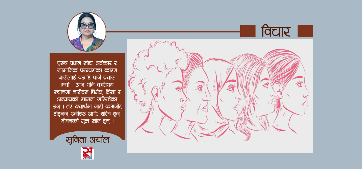 पुरुष प्रधान सोच, अहंकार र सामाजिक परम्पराका कारण नारीलाई पछाडि पार्ने प्रयास भयो । आज पनि कतिपय स्थानमा नारीहरू विभेद, हिंसा र अन्यायको सामना गरिरहेका छन् । तर यथार्थमा नारी कमजोर होइनन्, उनीहरू आदि शक्ति हुन्, जीवनको मूल स्रोत हुन् । हाम्रो संस्कृतिमा पनि नारीलाई अत्यन्त उच्च स्थान दिइएको छ ।