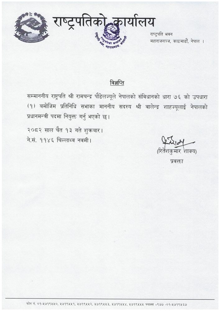 संविधानको धारा ७६ को १ अनुसार प्रतिनिधिसभामा बहुमत प्राप्त दलको नेताको रुपमा राष्ट्रपतिले बालेनलाई प्रधानमन्त्री नियुक्त गरेको राष्ट्रपतिको कार्यालयले जनाएको छ । शाहले आजै दिउँसो १२ः३४ बजे शीतल निवासमा प्रधानमन्त्रीको शपथ लिने तयारी छ ।