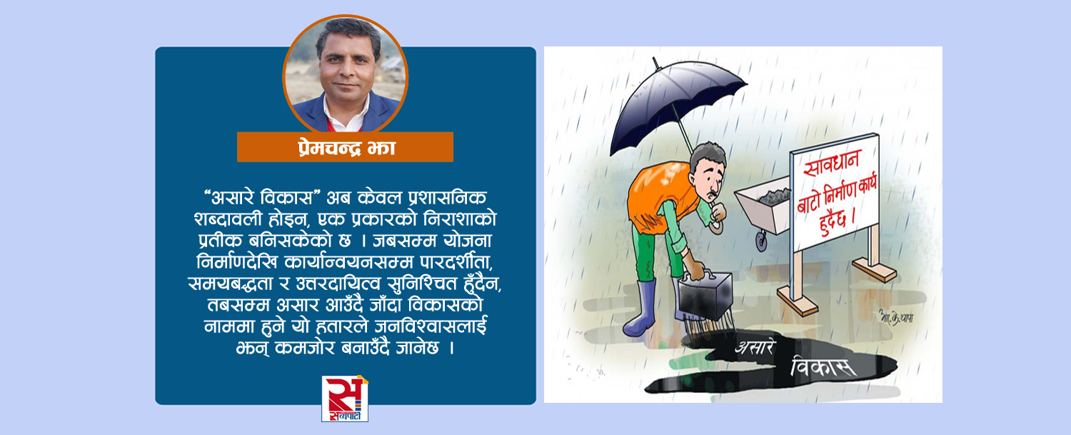अन्ततः प्रश्न उही पुरानै हो, विकास कसका लागि, कसरी र किन ? मधेसका बासिन्दाका लागि ‘असारे विकास’ अब केवल प्रशासनिक शब्दावली होइन, एक प्रकारको निराशाको प्रतीक बनिसकेको छ । जबसम्म योजना निर्माणदेखि कार्यान्वयनसम्म पारदर्शिता, समयबद्धता र उत्तरदायित्व सुनिश्चित हुँदैन, तबसम्म असार आउँदै जाँदा विकासको नाममा हुने यो हतारले जनविश्वासलाई झन् कमजोर बनाउँदै जानेछ । विकासको असली परीक्षा बजेट सक्ने गतिमा होइन, त्यसले नागरिकको जीवनमा ल्याउने स्थायी परिवर्तनमा हुन्छ । तर यदि प्राथमिकता फेरिएन भने, मधेसमा विकासको कथा अझै केही वर्ष ‘हतारको काम, लतरपतर’कै रूपमा लेखिँदै जानेछ ।