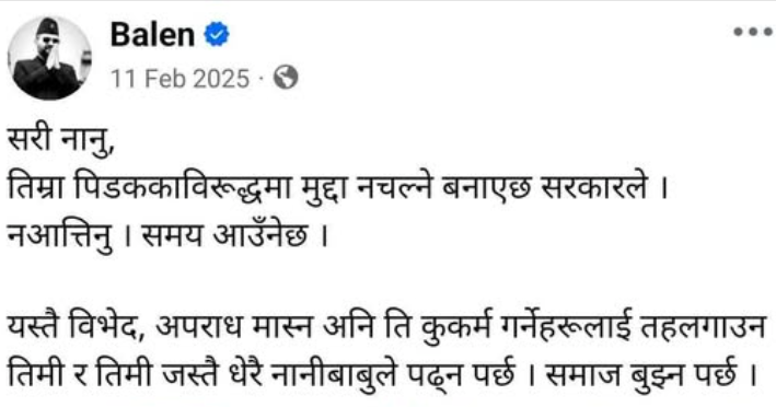 उनले लेखेका थिए, ‘सरी नानु, तिम्रा पिडककाविरूद्धमा मुद्दा नचल्ने बनाएछ सरकारले । नआत्तिनु । समय आउनेछ । यस्तै विभेद, अपराध मास्न अनि ती कुकर्म गर्नेहरूलाई तहलगाउन तिमी र तिमी जस्तै धेरै नानीबाबुले पढ्न पर्छ । समाज बुझ्नपर्छ ।’