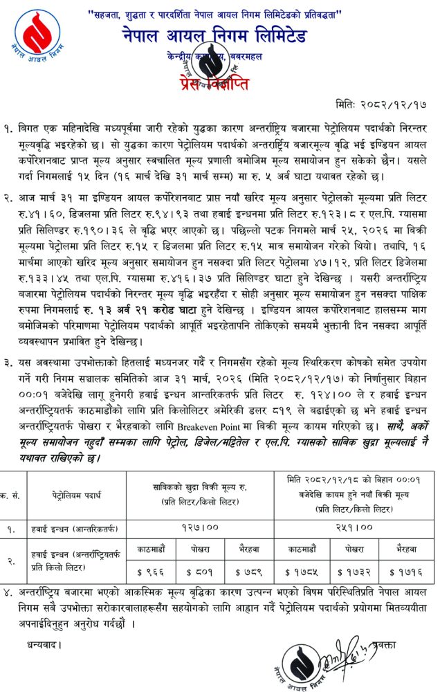 मंगलबार सार्वजनिक निगमको प्रेस विज्ञप्तिअनुसार हवाई इन्धनको मूल्य आन्तरिकतर्फ साविक १२७ प्रतिलिटर रहेकामा समायोजन गरेर २५१ रुपैयाँ प्रतिलिटर कायम गरिएको छ । यस्तै अन्तर्राष्ट्रिय उडानतर्फ काठमाडौंमा यसअघि प्रति किलोलिटर ९६६ अमेरिकी डलर रहेकामा नयाँ समायोजनअनुसार एक हजार ७८५ डलर पुगेको छ ।
