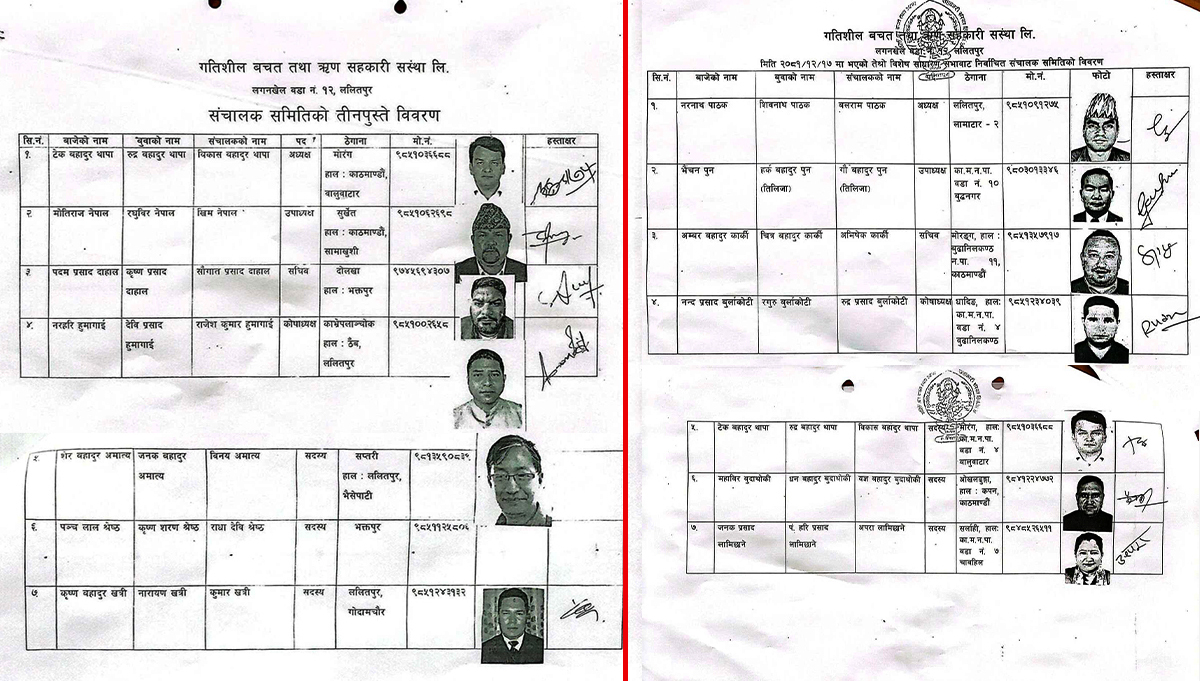 यो सहकारीको नालीबेली खोतल्ने क्रममा हामीले २०८१ चैत १७ गतेको तेस्रो विशेष साधारणसभाबाट डा.बलराम पाठक यसको सञ्चालक समिति अध्यक्ष बनेको भेट्यौँ । बागमती प्रदेश सरकारको सहकारी तथा गरिबी निवारण मन्त्रालयमा बुझाइएको सञ्चालक समितिको लगतअनुसार सहकारीको उपाध्यक्षमा गौबहादुर पुन, सचिव अभिषेक कार्की, कोषाध्यक्ष रुद्रप्रसाद बुर्लाकोटी तथा सदस्यहरू विकासबहादुर थापा, यज्ञबहादुर बुढाक्षेत्री र अपरा लामिछाने छन् ।