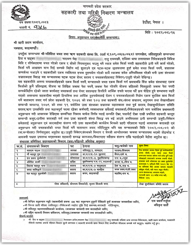सहकारी तथा गरिबी निवारण मन्त्रालयले आवश्यक अनुसन्धानका लागि प्रहरीलाई पठाएको पत्र ।