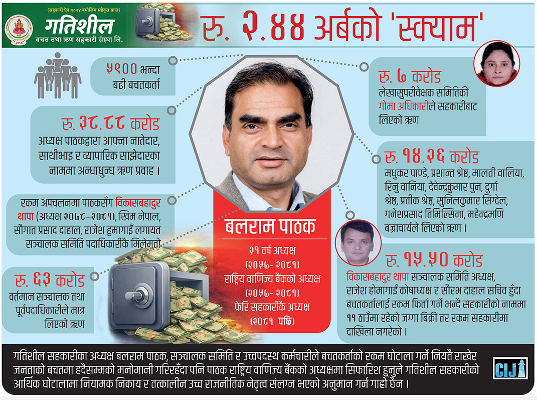 त्यसले समस्या बढाउन थाल्यो । उच्च अदालतमा दायर रिटमा पेस गरेको लिखित जवाफमा सञ्चालक खत्रीले पनि ‘कर्जा असुली प्रभावकारी हुन नसकेको’ र ‘बचत फिर्ता गर्न दबाब रहेको’ उल्लेख गरेका छन् । हामीले फेला पारेका कागजात र तथ्य केलाउँदा गतिशील सहकारीका पाँच हजार ९०० भन्दा धेरै बचतकर्ताको दुई अर्ब ४४ करोड रुपैयाँ सञ्चालकहरूबाट अपचलन भएको देखिन्छ । यसमध्ये ठूलो रकम अध्यक्ष पाठक र अरु सञ्चालकले आफ्नै व्यापारिक साझेदार र साथीभाइलाई कर्जा दिएका छन् ।