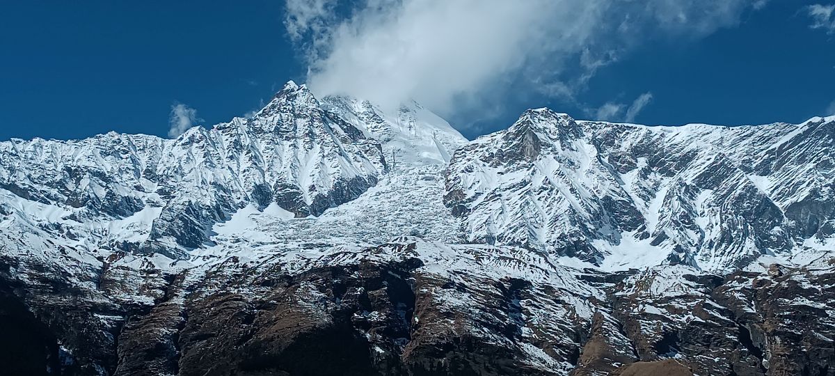मुस्ताङको थासाङ गाउँपालिका–२ स्थित खन्ती बगरबाट बिहीबार दिउँसो देखिएको सेताम्मे धौलागिरि हिमाल र आसपासमा क्षेत्र । बुधबार दिउँसो परेको भारी हिउँले धौलागिरी हिमाल चाँदी जस्तै टल्किएको हो । तस्वीर : सुशीलबाबु थकाली । रासस