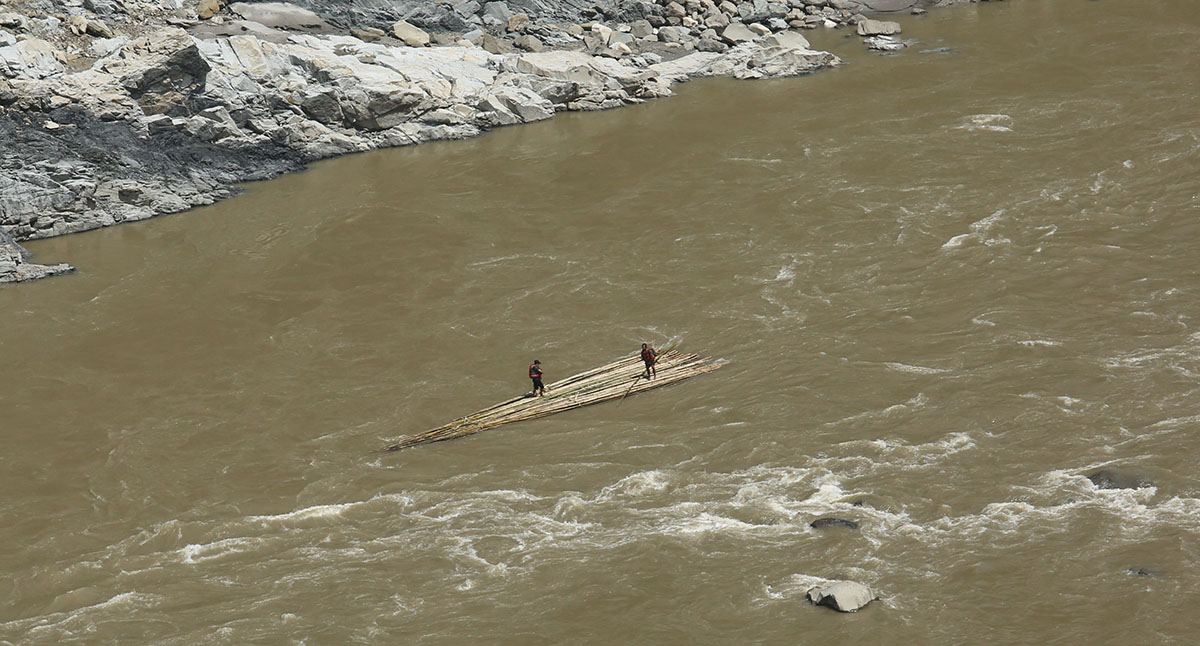 सुनसरीको वराहक्षेत्र नगरपालिका–१ स्थित सप्तकोशी नदीमा बाँसको चेफामा बसेर पानीको बहावसँगै यात्रा गरिरहेका किसान । भोजपुर, उदयपुर, धनकुटा लगायत विभिन्न ठाउँका किसान र व्यापारीले जोखिम मोलेर सप्तकोशीको जलमार्ग हुँदै ल्याएको बाँस सुनसरीको वराहक्षेत्र नगरपालिकाको चतरा तथा चक्रघट्टी पुर्‍याएपछि बिक्री गर्ने गर्छन् । तस्वीर : नवीन गड्तौला । रासस