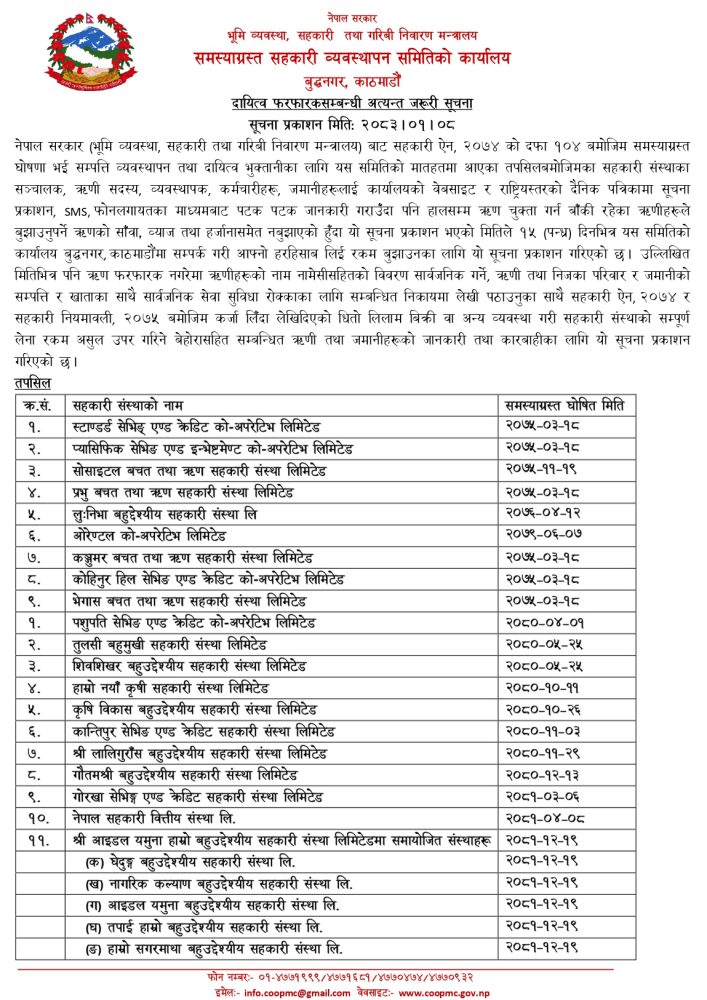 सूचनामा भनिएको छ, ‘नेपाल सरकार (भूमि व्यवस्था, सहकारी तथा गरिबी निवारण मन्त्रालय) बाट सहकारी ऐन, २०७४ को दफा १०४ बमोजिम समस्याग्रस्त घोषणा भई सम्पत्ति व्यवस्थापन तथा दायित्व भुक्तानीका लागि यस समितिको मातहतमा आएका तपसिल बमोजिमका सहकारी संस्थाका सञ्चालक, ऋणी सदस्य, व्यवस्थापक, कर्मचारीहरू, जमानीहरूलाई कार्यालयको वेबसाइट र राष्ट्रिय स्तरको दैनिक पत्रिकामा सूचना प्रकाशन, एसएमएस, फोन लगायतका माध्यमबाट पटक पटक जानकारी गराउँदा पनि हालसम्म ऋण चुक्ता गर्न बाँकी रहेका ऋणीहरूले बुझाउनुपर्ने ऋणको साँवा, व्याज तथा हर्जानासमेत नबुझाएको हुँदा यो सूचना प्रकाशन भएको मितिले १५ (पन्ध) दिनभित्र यस समितिको कार्यालय बुद्धनगर, काठमाडौँमा सम्पर्क गरी आफ्नो हरहिसाब लिई रकम बुझाउनका लागि यो सूचना प्रकाशन गरिएको छ ।’