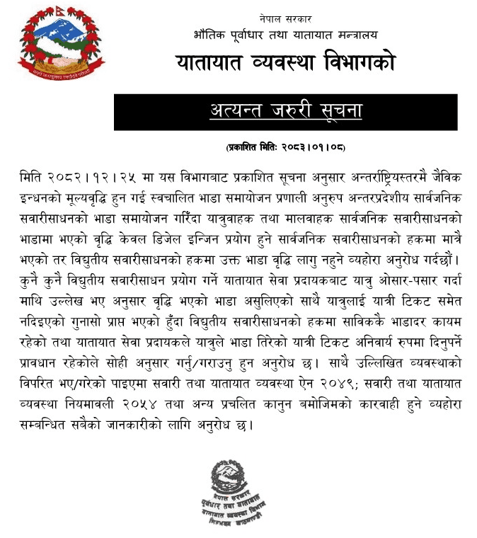 यातायात व्यवस्था विभागले हालै वृद्धि गरिएको सार्वजनिक सवारी साधनको भाडा विद्युतीय सवारीको हकमा लागू नहुने स्पष्ट पारेको छ । विभागले एक सूचना जारी गर्दै डिजेल इन्जिन प्रयोग हुने सवारी साधनको मात्र भाडा वृद्धि गरिएको जानकारी दिएको हो ।