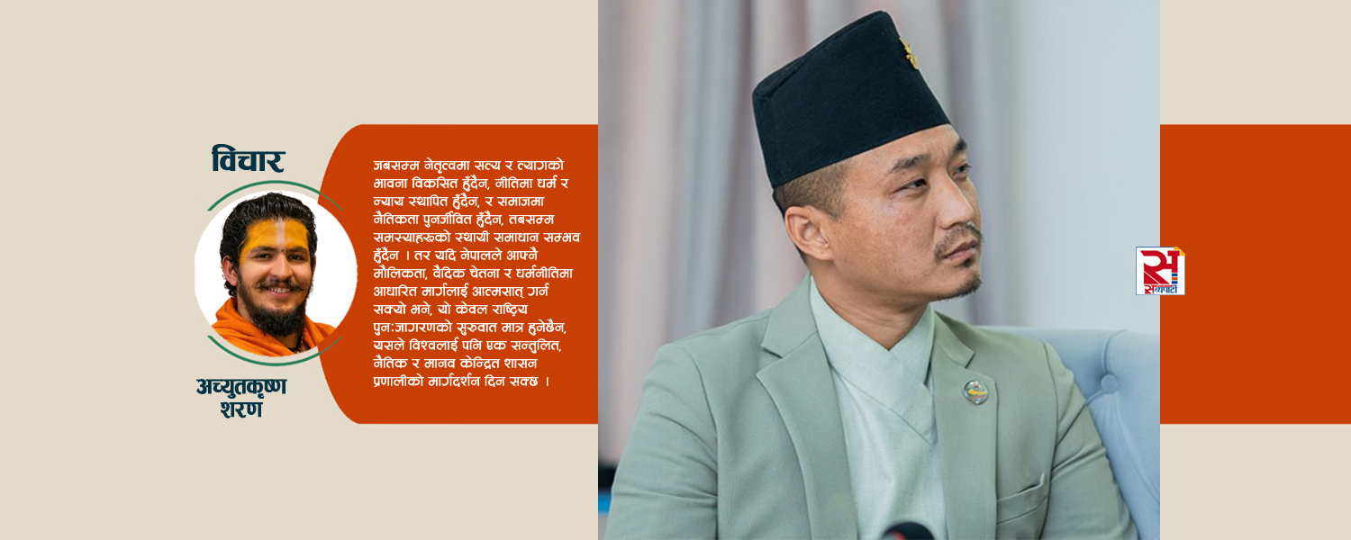 राज्य सञ्चालन गर्ने व्यक्तिहरूको व्यक्तिगत जीवन नै आदर्श र अनुकरणीय हुन्छ, किनकि चरित्रहीन नेतृत्वबाट सुशासन सम्भव हुँदैन । पारदर्शिता र उत्तरदायित्व यस्तो प्रणालीको अनिवार्य अंग हुन्छ, जहाँ प्रत्येक निर्णय र कार्यप्रति स्पष्ट जवाफदेहिता हुन्छ । साथै, विकासलाई केवल भौतिक पूर्वाधारमा सीमित नगरी मानवीय चेतना, नैतिकता र आध्यात्मिक उन्नतिसँग जोडिन्छ, जसले समग्र सन्तुलित विकास सुनिश्चित गर्छ । वर्तमान सन्दर्भमा हेर्दा, नेपाल सरकार र सम्पूर्ण नेतृत्व तहले गम्भीर आत्ममूल्यांकन गर्नु अपरिहार्य भइसकेको छ । जनताको विश्वास क्रमशः कमजोर हुँदै जानु, विरोध र असन्तुष्टि बढ्दै जानु यी सबै संकेत हुन् कि शासन प्रणालीमा गहिरो सुधार आवश्यक छ ।