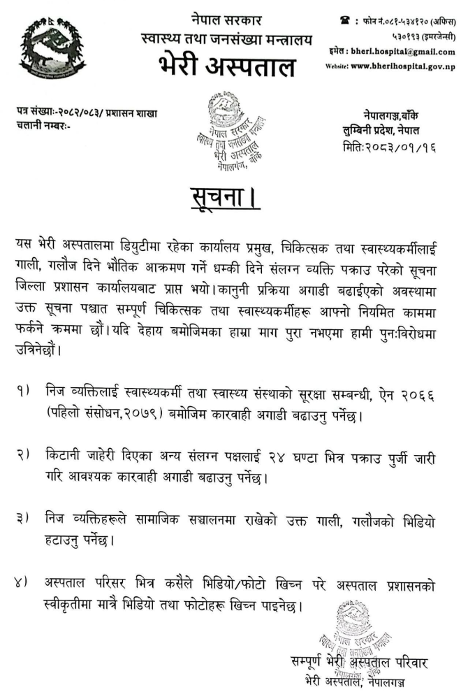 नेपालगन्जस्थित भेरी अस्पतालका चिकित्सकलाई धम्की दिने एक व्यक्ति पक्राउ परेपछि बन्द रहेको ओपिडी (बहिरङ्ग) सेवा पुनः सञ्चालन भएको छ । चिकित्सकहरूमाथि दुर्व्यवहार गर्दै ज्यान मार्ने धम्की दिएको आरोप लागेका कुशल दर्लामी पक्राउ परेपछि नेपालगन्जस्थित भेरी अस्पतालका आन्दोलनरत चिकित्सक तथा स्वास्थ्यकर्मीहरू काममा फर्किएका छन् ।